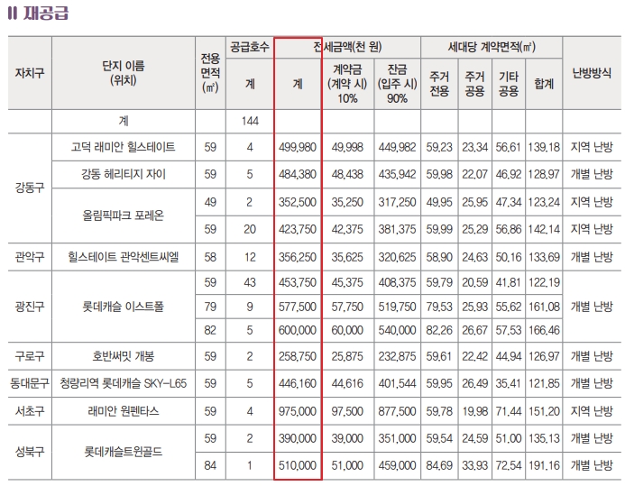 재공급 단지로는 강동구에 고래 래미안 힐스테이트 59㎡ 4세대, 강동 헤리티지 자이 59㎡ 5세대, 올림픽파크 포레온 49㎡ 2세대, 59㎡ 20세대를 공급합니다.