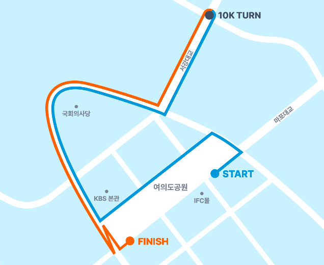 여의도공원을 끼고 달리다가 KBS본관 옆을 통과해 국회의사당 옆 도로를 지나 서강대교 북단에서 TURN을해 다시 여의도공원으로 돌아오는 코스입니다.
