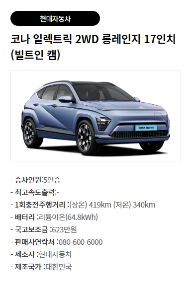 이 중 코나가 가장 많은 623만 원의 지원금을 받을 수 있습니다.